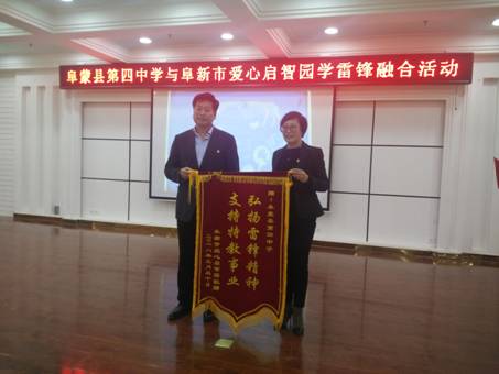 慰问活动中,第四中学师生参观了启智园各功能室,观看了视频资料,并在市残联多功能大厅举行了学雷锋融合活动,双方师生共叙友情,牵手联欢。此次慰问,四中向启智园赠送了教文具等共计142件,还有若干小礼物。这些礼品有篮球等教文具46件,牙刷等生活用品92件,魔方等玩具4件。礼品代表四中师生的情意,温暖着启智园师生及家长的心。启智园也向第四中学赠送了写有“弘扬雷锋精神,支持特教事业”的锦旗。