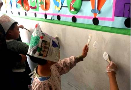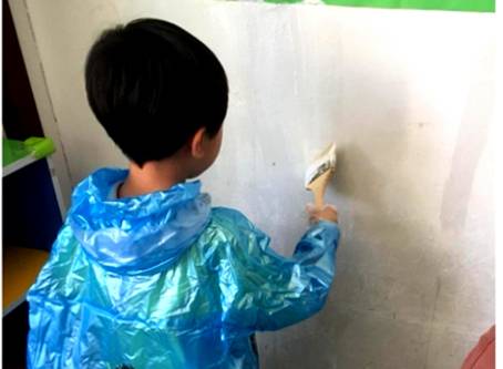 “五·一”前夕,市爱心启智园学前班班主任马飞老师给学生们上了一堂别开生面的群体课,就是带领学生们进行粉刷墙壁劳动。戴上用旧报纸做的帽子,穿上各种卫生衣服,学生们拿着板刷为教室的墙壁刷涂料。学生一下子知道了墙壁是怎么变白的,也体验到了劳动的乐趣。相册里所有的照片连续播映,展现出学生们完整的劳动场面,给欣赏者一个较强的视觉冲击力,令人情不自禁地为这些小小的粉刷匠点赞。可以看出,这堂课是老师精心策划的,对学生们的成长具有很深的意义。学生们刷墙的姿势与动作,俨然是热爱劳动的小粉刷匠。