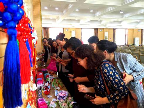 图为事业组成员在启智园“六一”活动现场够买特殊学生手工艺术作品