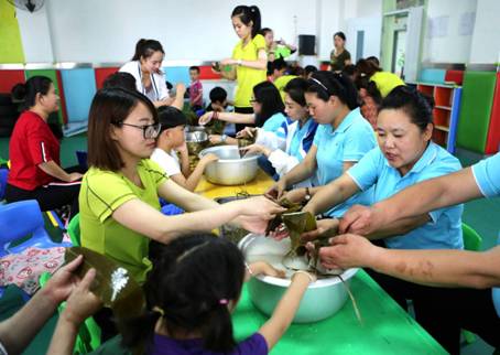 公司员工们带来粽叶、江米等包粽子的材料,与启智园师生及家长一起包粽子。粽子煮熟的时候,浓浓的清香飘满启智园,飘进师生及家长的心里。“吃粽子了,真香,真好吃。”孩子们一边吃着一边说。员工们还带来鸡蛋,也一并煮熟让孩子们品尝。