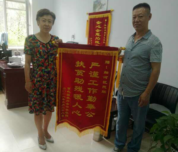 7月 5日,细河区百花园花卉合作社的经理残疾人赵德民,向区残联赠送了一面写有“严谨工作勤奉公,扶贫助残暖人心”的锦旗,区残联理事长刘畅接受锦旗并合影留念。