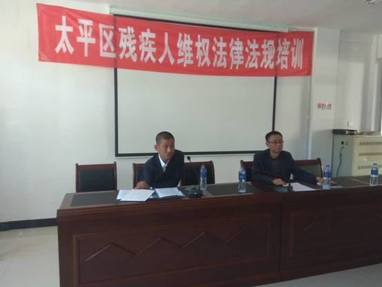 图为太平区残联理事长和市残联法律维权中心律师为残疾人进行培训
