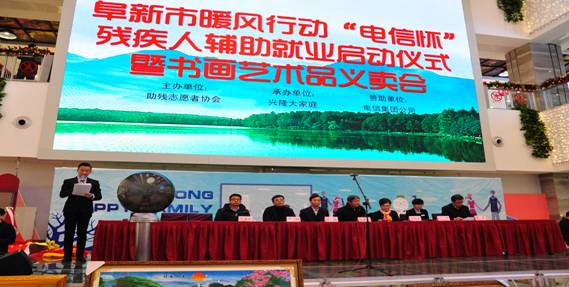 12月 13日,阜新市助残志愿者协会在兴隆大家庭举办的“暖风行动‘电信杯’残疾人辅助性就业启动仪式暨书画艺术作品爱心义卖会”隆重拉开帷幕。阜新市精神文明办副主任指导科科长王洪强、市残联副理事长张兴洲、中国人民人寿保险股份有限公司阜新中心支公司总经理刘军、中国人民建设银行阜新中心支行副行长叶世宏、中国电信集团公司阜新分公司副总经理刘翀、阜新市兴隆大家庭企管经理王宁、阜新市助残志愿者协会会长赵文楷等有关领导出席了此次义卖会。
