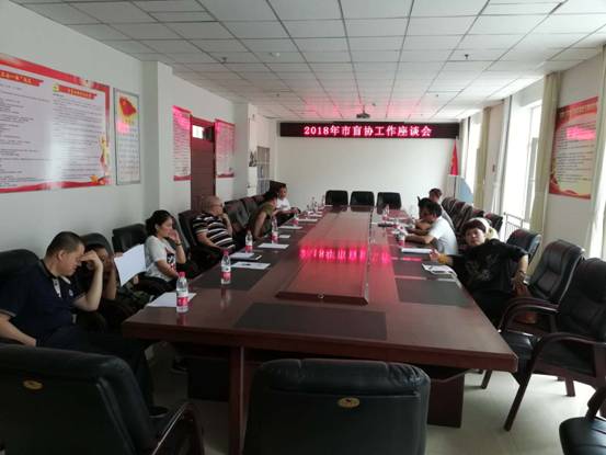 8月 24日,阜新市盲人协会在市残联五楼小会议室召开2018年工作座谈会,市残联副理事长杨青、社管办主任赵鑫,市盲协主席齐飞以及副主席、驻会理事、秘书长等共16人参加了此次会议,会议由驻会理事党国昕主持。