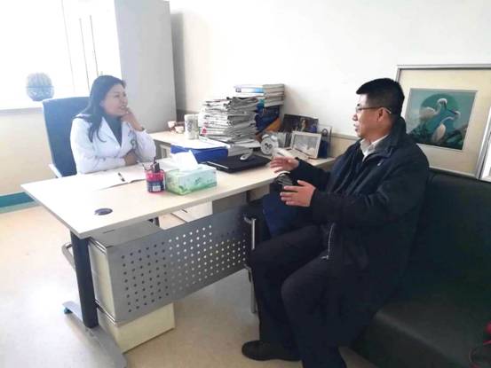 图为市残联党组书记、理事长赵作奎(右一)与消化内科史晓筠主任交流