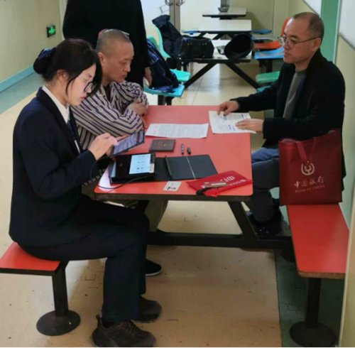 图为服务队员现场为精神残疾人办理金融业务,提供贴心金融服务